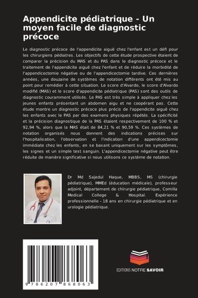 Le diagnostic précoce de l'appendicite aiguë chez l'enfant est un défi pour les chirurgiens pédiatres. Les objectifs de cette étude prospective étaient de comparer la précision du MAS et du PAS dans le diagnostic précoce et le traitement de l'appendicite aiguë chez l'enfant et de réduire la morbidité de l'appendicectomie négative ou de l'appendicectomie tardive. Ces dernières années, une douzaine de systèmes de notation différents ont été mis au point pour remédier à cette situation. Le score d'Alvardo, le score d'Alvardo modifié (MAS) et le score d'appendicite pédiatrique (PAS) sont des outils de diagnostic couramment utilisés. Le PAS est très simple à appliquer chez les jeunes enfants présentant un abdomen aigu et ne coopérant pas. Cette étude montre un diagnostic précoce plus précis de l'appendicite aiguë chez les enfants avec le PAS par des examens physiques répétés. La spécificité et la précision diagnostique de la PAS étaient respectivement de 100 % et 92,94 %, alors que la MAS était de 84,21 % et 90,59 %. Ces systèmes de notation organisés nous donnent des indications précises sur l'hospitalisation, l'observation et l'indication d'une appendicectomie immédiate chez les enfants, en se basant uniquement sur les symptômes, les signes et un simple test sanguin. L'appendicectomie négative peut être réduite de manière significative si nous utilisons ce système de notation.
