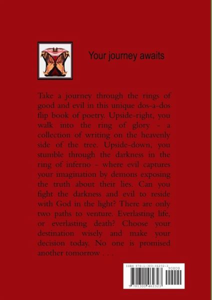 Take a journey through a ring of good and a ring of evil in this unique dos-a-dos flip book of poetry. Upside-right, you walk into the ring of Glory - a collection of writing on the heavenly side of the tree. Upside-down, you stumble through the darkness in the ring of Inferno - where evil captures your imagination by demons exposing the truth about their lies. Can you fight the darkness and evil to reside with God in the light? There are only two paths to venture. Everlasting life, or everlasting death? Choose your destination wisely and make your decision today. No one is promised another tomorrow . . .