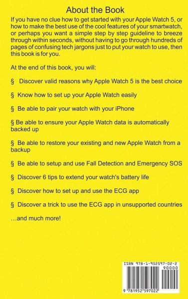 You spent a lot of money to get an Apple Watch 5, but you still don't know what to do to optimize its full potentials? The fact is there are tons of loads of hot secrets to making the best use of your Apple Watch. But, how do you start, where do you start, and what's the easiest way to make your watch perform its most basic and advanced capabilities, you may ask? Well, then, you are just about to find out. If you have no clue how to get started with your Apple Watch 5, or how to make the best use of the cool features of your smartwatch, or perhaps you want a simple step by step guideline to breeze through within seconds, without having to go through hundreds of pages of confusing tech jargons just to put your watch to use, then this book is for you. At the end of this book, you will: Discover valid reasons why Apple Watch 5 is the best wearable smartwatch Discover how to set up and use the ECG app Discover a trick to use the ECG app in unsupported countries Discover how to add and listen to music Discover how to practice mindfulness using the Breath app Discover how to find directions using the compass and map app Uncover ways to extend your battery life Know how to set up your Apple Watch easily Know how to set up and use the workout and activity fitness feature Be able to pair your watch with your iPhone Be able to ensure your Apple Watch data is automatically backed up Be able to restore your existing and new Apple Watch from a backup Be able to setup and use Fall Detection and Emergency SOS Be able to prevent and eject water from your watch Be able to send and reply messages Be able to make phone calls from you watch Be able to transfer calls from your watch to your iPhone conveniently Be able to set up and remotely control your Tv Be able to set up and use your Voice Assistant, Siri Be able to resolve the common worst Apple Watch 5 problems …and much more! If you really want to know how to max out your watch's features in simple steps, then don't overthink getting this book.