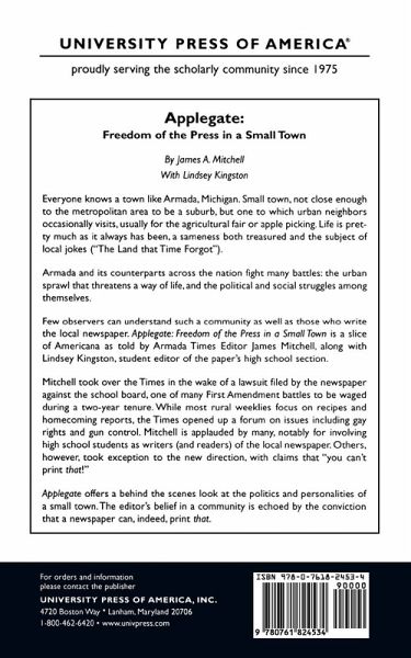 Applegate: Freedom of the Press in a Small Town is a slice of Americana as told by Armada Times Editor James Mitchell, along with Lindsey Kingston, student editor of the paper's high school section. Mitchell took over as editor of the Times in the wake of a lawsuit that had been filed by its publisher against the local school board, initiating one of the many First Amendment battles that would be waged during his two-year tenure.