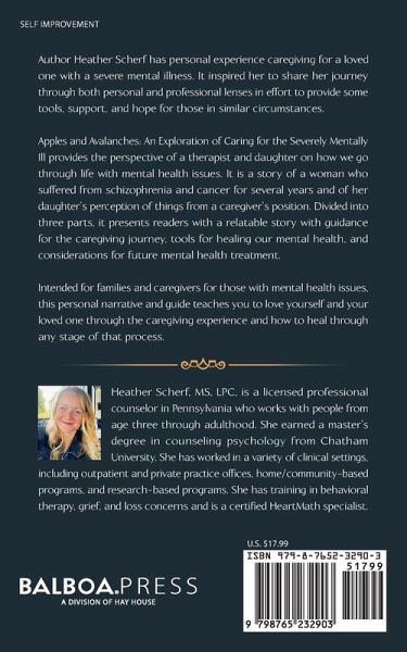 Author Heather Scherf has personal experience caregiving for a loved one with a severe mental illness. It inspired her to share her journey through both personal and professional lenses in effort to provide some tools, support, and hope for those in similar circumstances. Apples and Avalanches: An Exploration of Caring for the Severely Mentally Ill provides the perspective of a therapist and daughter on how we go through life with mental health issues. It is a story of a woman who suffered from schizophrenia and cancer for several years and of her daughter's perception of things from a caregiver's position. Divided into three parts, it presents readers with a relatable story with guidance for the caregiving journey, tools for healing our mental health, and considerations for future mental health treatment. Intended for families and caregivers for those with mental health issues, this personal narrative and guide teaches you to love yourself and your loved one through the caregiving experience and how to heal through any stage of that process.