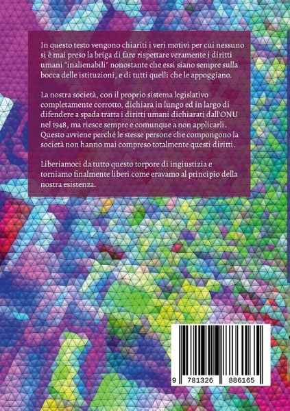 " In questo testo vengono chiariti i veri motivi per cui nessuno si è mai preso la briga di fare rispettare veramente i diritti umani "inalienabili", nonostante che siano sempre sulla bocca delle istituzioni, e di tutti quelli che le appoggiano." " La nostra società, con il proprio sistema legislativo completamente corrotto, dichiara in lungo ed in largo di difendere a spada tratta i diritti umani dichiarati dall'ONU nel 1948, ma riesce sempre e comunque a non applicarli. Questo avviene perché le stesse persone che compongono la società non hanno mai compreso totalmente questi diritti. " " Liberiamoci da tutto questo torpore di ingiustizia e torniamo finalmente liberi come eravamo al principio della nostra esistenza."
