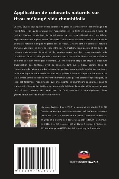 Le livre, Études pour appliquer des colorants végétaux naturels sur un tissu mélangé sida rhombifolia : Un guide pratique sur l'application et les tests de colorants à base de graines d'avocat et de bois de santal rouge sur un tissu mélangé sida rhombifolia. explique de manière générale les méthodes traditionnelles d'extraction & d'application de colorants naturels d'origine végétale sur les tissus. . Parmi tant de colorants naturels d'origine végétale, ce livre se concentre sur l'extraction, l'application et les tests de colorants de graines d'avocat et de sandale rouge sur des tissus mélangés sida rhombifolia. Le tissu mélangé Sida rhombifolia est composé de fibres sida rhombifolia et de fibres de coton mélangées ensemble. Le livre explique étape par étape la procédure d'application des teintures avec ou sans mordant sur le tissu. Compte tenu de l'importance de l'absorption des colorants et de leurs propriétés de solidité sur les tissus, le livre explique la méthode de test de ces propriétés à l'aide d'un spectrophotomètre UV-Vis. Compte tenu des risques environnementaux causés par les colorants synthétiques, ce livre est fortement recommandé aux enseignants et chercheurs spécialisés dans le traitement chimique des textiles, par exemple la teinture, d'exploiter et de détourner vers des colorants naturels très respectueux de l'environnement. il sera également d'une grande valeur pour les industries de teinture.