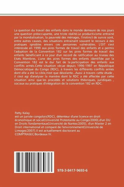 La question du travail des enfants dans le monde demeure de nos jours une question préoccupante, une triste réalité.Le productivisme entrainé par la mondialisation, la pauvreté des ménages, l'instinct de survie sont, entre autres causes, des situations entrainant souvent le recours à des pratiques ignobles envers ces personnes vulnérables. L'OIT s'est intéressée en 1999 aux pires formes de travail des enfants et a permis l'adoption de la Convention 182 sur les pires formes de travail des enfants bénéficiant à ce jour d'un record de ratification au niveau des Etats Membres. L'une des pires formes des enfants identifiée par la Convention 182 est le dur fait de la participation des enfants aux conflits armés.Cette situation vécue depuis 1996-1997 en République Démocratique du Congo (RDC), à travers les différents conflits armés dont elle a été la cible,n'est que désolante...Aussi à travers cette étude , il s'est agi d'analyser la manière dont la RDC a été affectée par cette situation ainsi que les procédés et solutions théoriques, juridiques , sociaux ou pratiques d'intégration de la convention 182 en RDC.