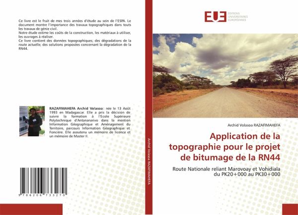 Ce livre est le fruit de mes trois années d'étude au sein de l'ESPA. Le document montre l'importance des travaux topographiques dans touts les travaux de génie civil.Notre étude estime les coûts de la construction, les matériaux à utiliser, les ouvrages à réaliser.Ce livre contient des données topographiques; des dégradations de la route actuelle; des solutions proposées concernant la dégradation de la RN44.