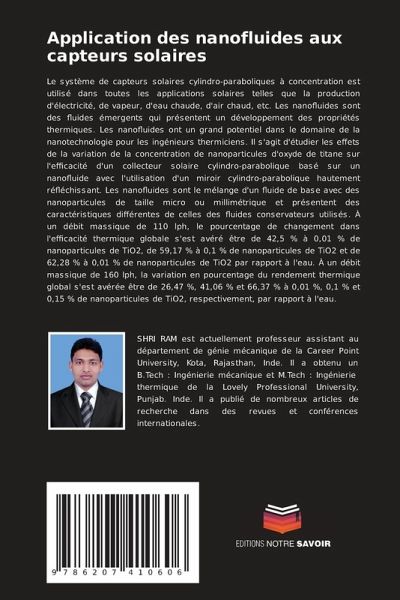 Le système de capteurs solaires cylindro-paraboliques à concentration est utilisé dans toutes les applications solaires telles que la production d'électricité, de vapeur, d'eau chaude, d'air chaud, etc. Les nanofluides sont des fluides émergents qui présentent un développement des propriétés thermiques. Les nanofluides ont un grand potentiel dans le domaine de la nanotechnologie pour les ingénieurs thermiciens. Il s'agit d'étudier les effets de la variation de la concentration de nanoparticules d'oxyde de titane sur l'efficacité d'un collecteur solaire cylindro-parabolique basé sur un nanofluide avec l'utilisation d'un miroir cylindro-parabolique hautement réfléchissant. Les nanofluides sont le mélange d'un fluide de base avec des nanoparticules de taille micro ou millimétrique et présentent des caractéristiques différentes de celles des fluides conservateurs utilisés. À un débit massique de 110 lph, le pourcentage de changement dans l'efficacité thermique globale s'est avéré être de 42,5 % à 0,01 % de nanoparticules de TiO2, de 59,17 % à 0,1 % de nanoparticules de TiO2 et de 62,28 % à 0,01 % de nanoparticules de TiO2 par rapport à l'eau. À un débit massique de 160 lph, la variation en pourcentage du rendement thermique global s'est avérée être de 26,47 %, 41,06 % et 66,37 % à 0,01 %, 0,1 % et 0,15 % de nanoparticules de TiO2, respectivement, par rapport à l'eau.