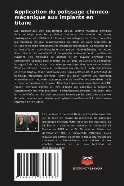 Les biomatériaux sont couramment utilisés comme matériaux d'implant dans le corps pour les prothèses dentaires, l'orthopédie, les valves cardiaques et les cathéters. Le titane et ses alliages sont connus pour être les matériaux les plus biocompatibles en raison de leurs propriétés de surface et de leurs extraordinaires propriétés mécaniques. La rugosité de la surface et la formation d'oxydes en surface sont deux méthodes permettant d'accroître la biocompatibilité et de garantir la bio-inertie du matériau de l'implant. Les méthodes de sablage et de gravure chimique sont couramment utilisées pour modeler les surfaces de titane afin de modifier la rugosité de la surface, mais elles peuvent entraîner une contamination. D'autres solutions, comme le revêtement par plasma à haute température et le modelage au laser, sont coûteuses. Dans cette étude, le processus de polissage mécanique chimique (CMP) est établi comme une technique alternative aux méthodes existantes afin de modifier les propriétés de la surface du matériau de l'implant. Dans les applications implantaires du CMP, l'action chimique génère un film d'oxyde qui contribue à réduire la contamination des implants dans l'environnement corporel, réduisant ainsi le risque d'infection. L'action mécanique fournie par les particules abrasives de taille nanométrique, d'autre part, génère simultanément la structuration contrôlée de la surface.