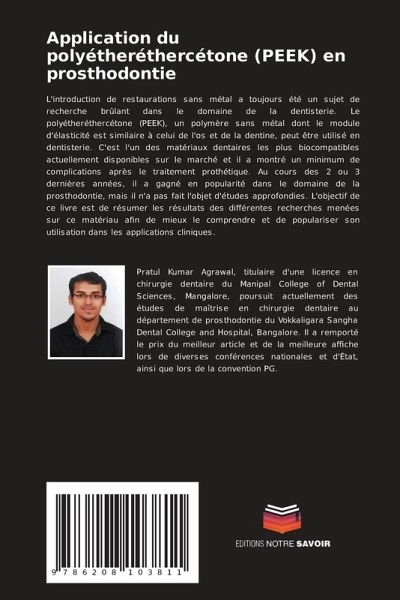L'introduction de restaurations sans métal a toujours été un sujet de recherche brûlant dans le domaine de la dentisterie. Le polyétheréthercétone (PEEK), un polymère sans métal dont le module d'élasticité est similaire à celui de l'os et de la dentine, peut être utilisé en dentisterie. C'est l'un des matériaux dentaires les plus biocompatibles actuellement disponibles sur le marché et il a montré un minimum de complications après le traitement prothétique. Au cours des 2 ou 3 dernières années, il a gagné en popularité dans le domaine de la prosthodontie, mais il n'a pas fait l'objet d'études approfondies. L'objectif de ce livre est de résumer les résultats des différentes recherches menées sur ce matériau afin de mieux le comprendre et de populariser son utilisation dans les applications cliniques.