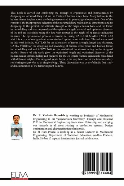 This Book is carried out combining the concept of ergonomics and biomechanics by designing an intramedullary rod for the fractured human femur bone. Many failures in the human femur implantations are being encountered in post-surgical operations. One of the reasons is the inappropriate selection of the intramedullary rod material, dimensions and its designing. In this project, the ultimate strength of the original femur bone and the femur intramedullary rod are compared and the optimum length, material and optimum diameter of the rod are calculated using the data with respect to the height of 31 female individual humans. The optimization process is carried out using RANDOM SEARCH METHOD which is a type of non-gradient, unconstrained optimization technique. The softwares used in this work include, MATLAB for the calculation of femur strength, length and diameter, CATIA V5R20 for the designing and modeling of human femur bone and human femur intramedullary rod and ANSYS 16.0 for the analysis of the stresses acting on the designed models. Results of this work gives the optimized length and optimized diameter of the human femur intramedullary rod required for the 31 female human individuals considered with different heights. The designed model helps in the easy insertion of the intramedullary rod during surgery due to its simple design. These dimensions can be useful in further study and minimization of the femur implant failures.