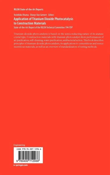 Authors and Acknowledgements.- Preface; 1. Introduction, by Y. Ohama and D. Van Gemert.- 2. Principles of TiO2 photocatalysis, by M. Castellote and N. Bengtsson.- 3. Application of TiO2 photocatalysis to cementitious materials for self-cleaning purposes, by A. Maury and N. De Belie.- 4. Application of antibacterial and self-cleaning effects to noncementitious construction materials, by Y. Saeki.- 5. Applications of TiO2 photocatalysis for air purification, by A. Beeldens, L. Cassar and Y. Murata.- 6. Standardization of testing methods for construction materials with TiO2 photocatalyst, by K. Motohashi, F. Dehn and Y. Ohama.- 7. Conclusions, by Y. Ohama and D. Van Gemert.- 8. Reference list.