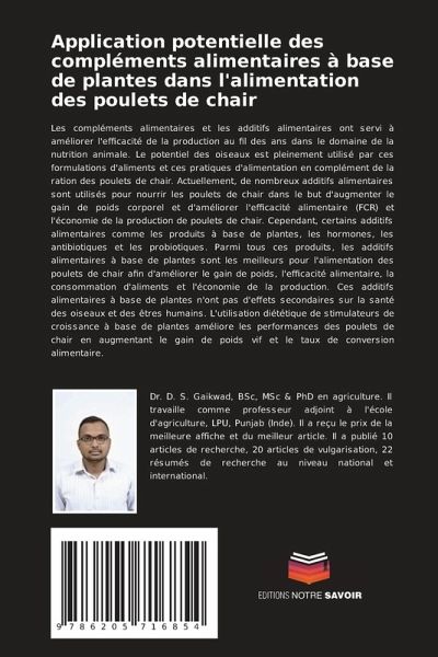 Les compléments alimentaires et les additifs alimentaires ont servi à améliorer l'efficacité de la production au fil des ans dans le domaine de la nutrition animale. Le potentiel des oiseaux est pleinement utilisé par ces formulations d'aliments et ces pratiques d'alimentation en complément de la ration des poulets de chair. Actuellement, de nombreux additifs alimentaires sont utilisés pour nourrir les poulets de chair dans le but d'augmenter le gain de poids corporel et d'améliorer l'efficacité alimentaire (FCR) et l'économie de la production de poulets de chair. Cependant, certains additifs alimentaires comme les produits à base de plantes, les hormones, les antibiotiques et les probiotiques. Parmi tous ces produits, les additifs alimentaires à base de plantes sont les meilleurs pour l'alimentation des poulets de chair afin d'améliorer le gain de poids, l'efficacité alimentaire, la consommation d'aliments et l'économie de la production. Ces additifs alimentaires à base de plantes n'ont pas d'effets secondaires sur la santé des oiseaux et des êtres humains. L'utilisation diététique de stimulateurs de croissance à base de plantes améliore les performances des poulets de chair en augmentant le gain de poids vif et le taux de conversion alimentaire.