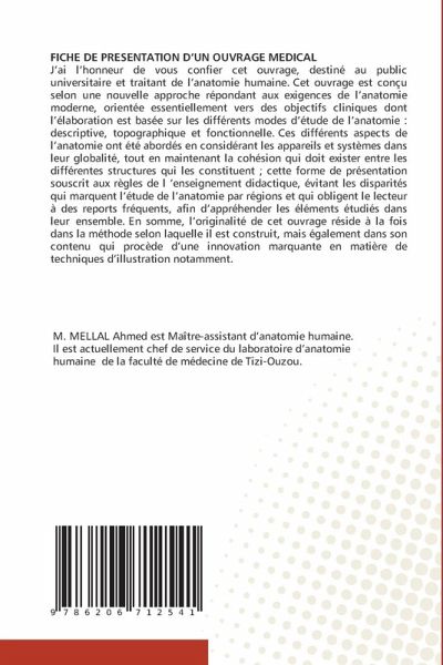 FICHE DE PRESENTATION D'UN OUVRAGE MEDICAL J'ai l'honneur de vous confier cet ouvrage, destiné au public universitaire et traitant de l'anatomie humaine. Cet ouvrage est conçu selon une nouvelle approche répondant aux exigences de l'anatomie moderne, orientée essentiellement vers des objectifs cliniques dont l'élaboration est basée sur les différents modes d'étude de l'anatomie : descriptive, topographique et fonctionnelle. Ces différents aspects de l'anatomie ont été abordés en considérant les appareils et systèmes dans leur globalité, tout en maintenant la cohésion qui doit exister entre les différentes structures qui les constituent ; cette forme de présentation souscrit aux règles de l 'enseignement didactique, évitant les disparités qui marquent l'étude de l'anatomie par régions et qui obligent le lecteur à des reports fréquents, afin d'appréhender les éléments étudiés dans leur ensemble. En somme, l'originalité de cet ouvrage réside à la fois dans la méthode selon laquelle il est construit, mais également dans son contenu qui procède d'une innovation marquante en matière de techniques d'illustration notamment.