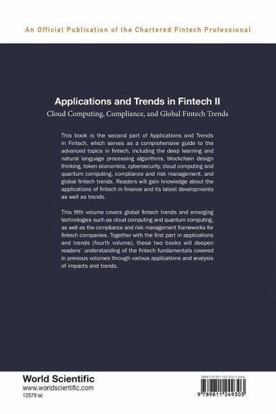 This book is the second part of Applications and Trends in Fintech, which serves as a comprehensive guide to the advanced topics in fintech, including the deep learning and natural language processing algorithms, blockchain design thinking, token economics, cybersecurity, cloud computing and quantum computing, compliance and risk management, and global fintech trends. Readers will gain knowledge about the applications of fintech in finance and its latest developments as well as trends. This fifth volume covers global fintech trends and emerging technologies such as cloud computing and quantum computing, as well as the compliance and risk management frameworks for fintech companies. Together with the first part in applications and trends (fourth volume), these two books will deepen readers' understanding of the fintech fundamentals covered in previous volumes through various applications and analysis of impacts and trends.