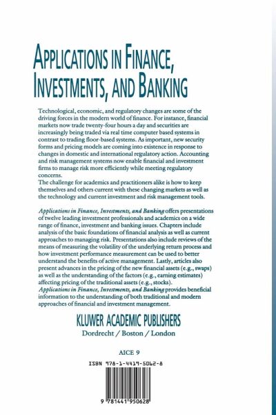 Applications in Finance, Investments, and Banking offers presentations by twelve leading investment professionals and academics on a wide range of finance, investment and banking issues. Chapters include analysis of the basic foundations of financial analysis, as well as current approaches to managing risk. Presentations also include reviews of the means of measuring the volatility of the underlying return process and how investment performance measurement can be used to better understand the benefits of active management. Finally, articles also present advances in the pricing of the new financial assets (e.g., swaps), as well as the understanding of the factors (e.g., earnings estimates) affecting pricing of the traditional assets (e.g., stocks).
