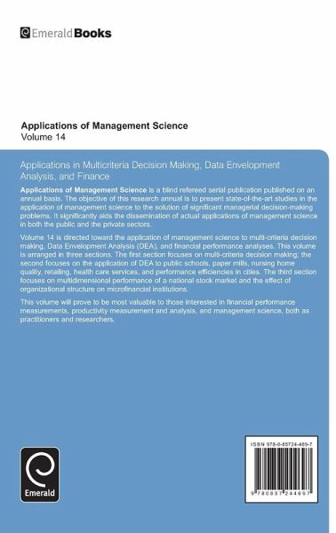 "Applications of Management Science" is a blind refereed serial publication published on an annual basis. The objective of this research annual is to present state-of-the-art studies in the application of management science to the solution of significant managerial decision-making problems. It significantly aids the dissemination of actual applications of management science in both the public and private sectors. Volume 14 of the series addresses Multi-Criteria Decision Making, Data Envelopment Analysis, and Financial Applications.