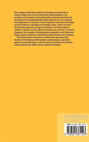The unique contribution made by biological anthropology to human welfare lies in the fundamental understanding it can provide of the dynamic interrelationships between physical and social factors. By understanding these patterns, we can interpret the significance of variation in such measures of human well-being in terms of the incidence of disease and mortality rates. Topics covered include reproductive ecology and fertility, nutritional status in relation to health, and the effects of pollution on growth. In the later chapters, the concepts of physiological adaptation, and Darwinian fitness and its relation to individual physical fitness are explored.