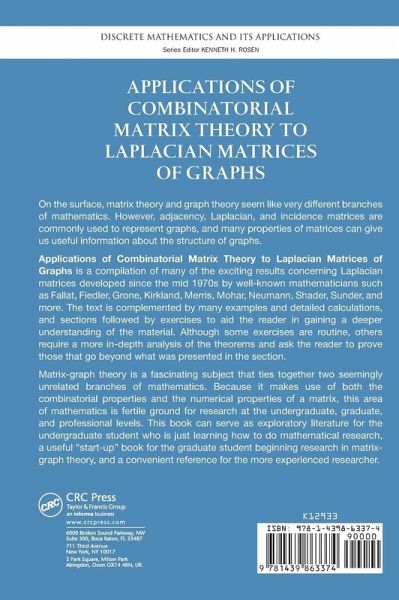 On the surface, matrix theory and graph theory seem like very different branches of mathematics. However, adjacency, Laplacian, and incidence matrices are commonly used to represent graphs, and many properties of matrices can give us useful information about the structure of graphs. Applications of Combinatorial Matrix Theory to Laplacian Matrices of Graphs is a compilation of many of the exciting results concerning Laplacian matrices developed since the mid 1970s by well-known mathematicians such as Fallat, Fiedler, Grone, Kirkland, Merris, Mohar, Neumann, Shader, Sunder, and more. The text is complemented by many examples and detailed calculations, and sections followed by exercises to aid the reader in gaining a deeper understanding of the material. Although some exercises are routine, others require a more in-depth analysis of the theorems and ask the reader to prove those that go beyond what was presented in the section. Matrix-graph theory is a fascinating subject that ties together two seemingly unrelated branches of mathematics. Because it makes use of both the combinatorial properties and the numerical properties of a matrix, this area of mathematics is fertile ground for research at the undergraduate, graduate, and professional levels. This book can serve as exploratory literature for the undergraduate student who is just learning how to do mathematical research, a useful "start-up" book for the graduate student beginning research in matrix-graph theory, and a convenient reference for the more experienced researcher.
