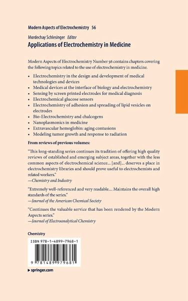 "Electrochemical applications in medicine are growing rapidly, and are under recognised, so the appearance of this book is timely. ... It is likely to be of more interest to electrochemists than to a general medical audience, but will be important to medical specialists exploring electrochemical approaches to therapy and diagnosis. ... this book is a timely and valuable contribution to a growing field, and it is to hoped will gain the attention of both clinicians and electrochemists." (Michael Brand, Sensor 100 Newsletter, sensor100.com, June, 2013)