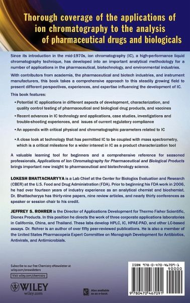 Lokesh Bhattacharyya is a Lab Chief at the Center for Biologics Evaluation and Research (CBER) at the U.S. Food and Drug Administration (FDA). Prior to beginning his FDA work in 2006, he had over fourteen years of industry experience as an analytical chemist and biochemist. Dr. Bhattacharyya has thirty-nine papers, nine review articles, and nearly thirty conferences as speaker or session chair to his credit. Jeffrey S. Rohrer is the Director of Applications Development for Thermo Fisher Scientific, Dionex Products. In this position he directs the work of three corporate applications laboratories in California, China, and Thailand. These labs develop HPLC, IC, HPAE-PAD, and other LC-based assays. Dr. Rohrer is an author of over fifty peer-reviewed publications. He is also a member of the United States Pharmacopeia Expert Committee on Monograph Development for Antibiotics, Antivirals, and Antimicrobials.