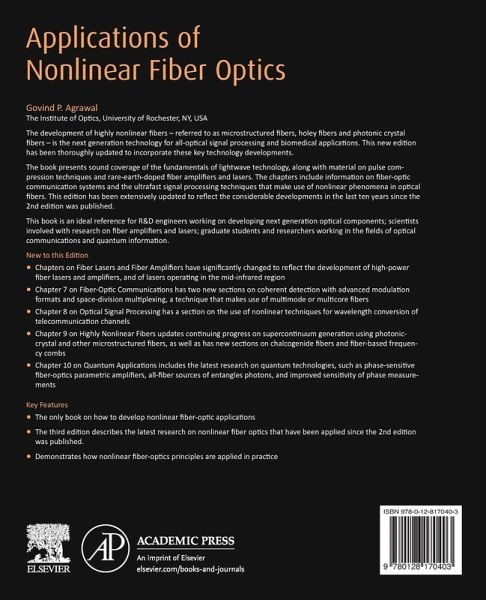 Applications of Nonlinear Fiber Optics, Third Edition presents sound coverage of the fundamentals of lightwave technology, along with material on pulse compression techniques and rare-earth-doped fiber amplifiers and lasers. The book's chapters include information on fiber-optic communication systems and the ultrafast signal processing techniques that make use of nonlinear phenomena in optical fibers. This book is an ideal reference for R&D engineers working on developing next generation optical components, scientists involved with research on fiber amplifiers and lasers, graduate students, and researchers working in the fields of optical communications and quantum information.