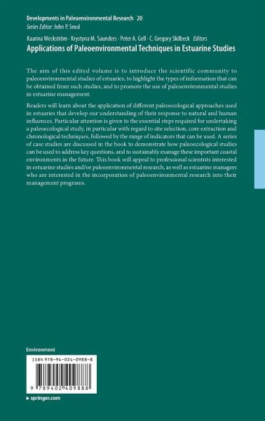 Introduction to the Application of Palaeoecological Techniques in Estuaries.-Part I Estuaries and their Management.- Estuary Form and Function: Implications for Palaeoecological Studies.- Geology and Sedimentary History of Modern Estuaries.- Palaeoecological Evidence for Variability and Change in Estuaries: Insights for Management.-Part II Coring and Dating of Estuarine Sediments.- Sediment Sampling in Estuaries - Site Selection and Sampling Techniques.- Some Practical Considerations Regarding the Application of 210Pb and 137Cs Dating to Estuarine Sediments.-RadiocarbonDating in Estuarine Environments.- Part III Techniques for Palaeoenvironmental Reconstructions in Estuaries.- Lipid Biomarkers as Organic Geochemical Proxies for the Paleoenvironmental Reconstruction of Estuarine Environments.- C/N ratios and Carbon Isotope Composition of Organic Matter in Estuarine Environments.- Physical and Chemical Factors to Consider when Studying Historical Contamination and Pollution in Estuaries.- Diatoms as Indicators of Environmental Change in Estuaries.- Dinoflagellate Cysts as Proxies for Holocene Environmental Change in Estuaries: Diversity, Abundance and Morphology.- Applications of Foraminifera, Testate Amoebae and Tintinnids in Estuarine Palaeoecology.- Ostracods as Recorders of Palaeoenvironmental Change in Estuaries.- Application of Molluscan Analyses to the Reconstruction of Past Environmental Conditions in Estuaries.- Corals in Estuarine Environments: Their Response to Environmental Changes and Application in Reconstructing Past Environmental Variability.- Inferring Environmental Change in Estuariesfrom Plant Macrofossils.- Applications of Pollen Analysis in Estuarine Systems.- Part IV Case Studies.- Palaeo-Environmental Approaches to Reconstructing Sea Level Changes in Estuaries.- Paleoecology Studies in Chesapeake Bay: A Model System for Understanding Interactions between Climate, Anthropogenic Activities and the Environment.- Paleosalinity Changes in the Río de la Plata Estuary and on the Adjacent Uruguayan Continental Shelf over the Past 1,200 Years: An Approach Using Diatoms as a Proxy.- Application of Paleoecology to Ecosystem Restoration: A Case Study from South Florida's Estuaries.- Paleolimnological History of The Coorong: Identifying the Natural Ecological Character of a Ramsar Wetland in Crisis.- Palaeoenvironmental History of the Baltic Sea - One of the Largest Brackish-water Ecosystems in the World