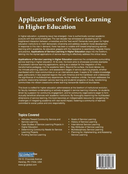 In higher education, a pressing issue has emerged-how to authentically connect academic pursuits with real-world challenges. The last decade has witnessed an escalating call for heightened interaction between universities and the "real world". Demands have grown for higher education institutions to instill democratic citizenship and address students' moral development. In response to this rise in demand, there has been a notable shift toward emphasizing service learning within academia. As educators grapple with the imperative to seamlessly integrate theory and practice, Applications of Service Learning in Higher Education steps into the forefront, delving into the myriad applications of service learning to effectively address this critical issue. Applications of Service Learning in Higher Education examines the complexities surrounding service learning in higher education. At its core, the book aims to showcase concrete examples of successful service learning applications, acting as a catalyst for the integration of this transformative pedagogy into the academic fabric. Beyond the surface, the book delves into the intricate planning, execution, and assessment stages of service learning projects, whether manifested within local communities or on an international scale. It seeks to fill notable knowledge gaps, particularly in less-explored regions like Latin America and the Caribbean and underscores the significance of multidisciplinary experiences. As the narrative unfolds, the book addresses the symbiotic relationship between service learning and students' programs of study, transforming communities into vibrant classrooms where learning transcends traditional boundaries.