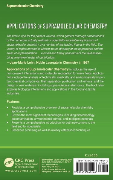 Applications of Supramolecular Chemistry introduces the use of non-covalent interactions and molecular recognition for many fields. Applications include the analysis of technically, medically, and environmentally important chemical compounds, their separation, purification and removal, and the design of new materials, including supramolecular electronics. The book also explores biological interactions and applications in the food and textile industries.