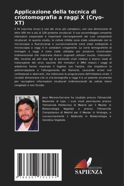 Il VV (vaccinia virus) è uno dei virus più complessi, con una dimensione di oltre 300 nm e più di 100 proteine strutturali. Il suo assemblaggio comporta interazioni sequenziali e importanti riarrangiamenti dei suoi componenti strutturali. In questo studio, le cellule infette sono state selezionate con la microscopia a fluorescenza e successivamente sono state sottoposte a microscopia a raggi X in condizioni criogeniche. Le serie tomografiche di immagini a raggi X sono state utilizzate per produrre ricostruzioni tridimensionali che mostrano diversi organelli cellulari (nuclei, mitocondri, ER), insieme ad altri due tipi di particelle virali relative a diversi stadi di maturazione del virus vaccinia (IV) immaturi e (MV) maturi; i saggi di witaferina hanno mostrato il legame con l'actina, che impedisce la polimerizzazione e l'allungamento dei filamenti, causando virioni mal confezionati o aberranti, che inibiscono la progressione dell'infezione virale. I risultati dimostrano che la crio-tomografia a raggi X è un potente strumento per raccogliere informazioni strutturali tridimensionali da cellule intere congelate e non fissate.