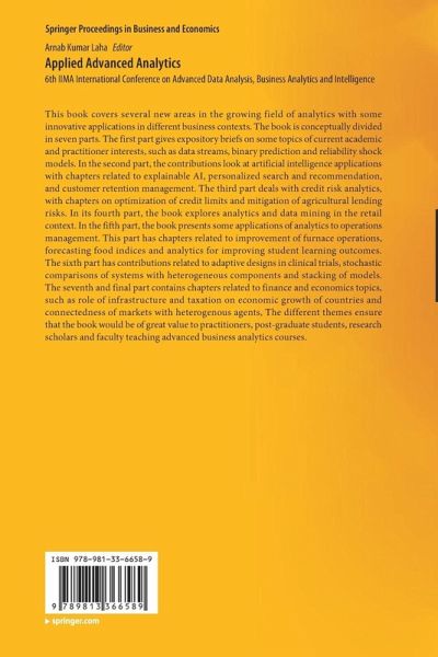 This book covers several new areas in the growing field of analytics with some innovative applications in different business contexts, and consists of selected presentations at the 6th IIMA International Conference on Advanced Data Analysis, Business Analytics and Intelligence. The book is conceptually divided in seven parts. The first part gives expository briefs on some topics of current academic and practitioner interests, such as data streams, binary prediction and reliability shock models. In the second part, the contributions look at artificial intelligence applications with chapters related to explainable AI, personalized search and recommendation, and customer retention management. The third part deals with credit risk analytics, with chapters on optimization of credit limits and mitigation of agricultural lending risks. In its fourth part, the book explores analytics and data mining in the retail context. In the fifth part, the book presents some applications of analytics to operations management. This part has chapters related to improvement of furnace operations, forecasting food indices and analytics for improving student learning outcomes. The sixth part has contributions related to adaptive designs in clinical trials, stochastic comparisons of systems with heterogeneous components and stacking of models. The seventh and final part contains chapters related to finance and economics topics, such as role of infrastructure and taxation on economic growth of countries and connectedness of markets with heterogenous agents, The different themes ensure that the book would be of great value to practitioners, post-graduate students, research scholars and faculty teaching advanced business analytics courses.