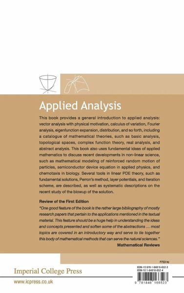 This book provides a general introduction to applied analysis; vector analysis with physical motivation, calculus of variation, Fourier analysis, eigenfunction expansion, distribution, and so forth, including a catalogue of mathematical theories, such as basic analysis, topological spaces, complex function theory, real analysis, and abstract analysis. This book also uses fundamental ideas of applied mathematics to discuss recent developments in nonlinear science, such as mathematical modeling of reinforced random motion of particles, semiconductor device equation in applied physics, and chemotaxis in biology. Several tools in linear PDE theory, such as fundamental solutions, Perron's method, layer potentials, and iteration scheme, are described, as well as systematic descriptions on the recent study of the blowup of the solution.