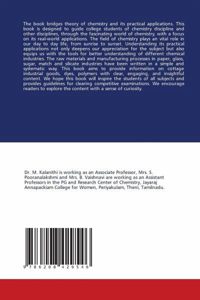 The book bridges theory of chemistry and its practical applications. This book is designed to guide college students of chemistry discipline and other disciplines, through the fascinating world of chemistry, with a focus on its real-world applications. The field of chemistry plays an vital role in our day to day life, from sunrise to sunset. Understanding its practical applications not only deepens our appreciation for the subject but also equips us with the tools for better understanding of different chemical industries. The raw materials and manufacturing processes in paper, glass, sugar, match and silicate industries have been written in a simple and systematic way. This book aims to provide information on cottage industrial goods, dyes, polymers with clear, engaging, and insightful content. We hope this book will inspire the students of all subjects and provides guidelines for clearing competitive examinations. We encourage readers to explore the content with a sense of curiosity.