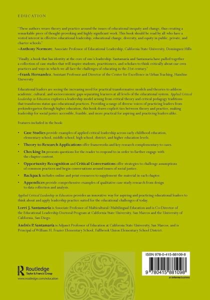 Educational leaders are seeing the increasing need for practical transformative models and theories to address academic, cultural, and socio-economic gaps separating learners at all levels of the educational system. Applied Critical Leadership in Education explores a leadership model arising from critical theory and critical pedagogy traditions that transforms status quo educational practices. Providing a range of diverse voices of practicing leaders from prekindergarten through higher education, explicit ties to theory and practice are drawn, making leadership for social justice accessible, feasible, and more practical for aspiring and practicing leaders alike. Features Included: Case Studies provide examples of applied critical leadership across early childhood education, elementary school, middle school, high school, district, and higher education levels. Theory to Research Applications offer frameworks and key research complementary to cases. Checking In presents questions to the reader to respond and further engage with the chapter content. Opportunity Recognition and Critical Conversations offer strategies to challenge assumptions of common practices and begin conversations around issues of social justice. Backpack includes online or print resources to supplement the material in each chapter. Appendix provides a comprehensive example of qualitative case study research from design, to data collection, and analysis. Applied Critical Leadership in Education provides an innovative way for aspiring and practicing educational leaders to think about and apply leadership practice suited for the educational challenges of today that are necessary for change.