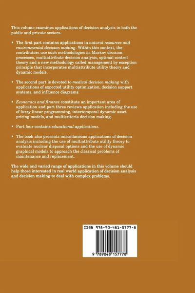 Taking advantage of the many specialists visiting Spain prior to the INFORMS Meeting in Barcelona, hold from July 14th to July 17th 1997, we organized a work shop on Decision Analysis Applications at the Real Academia de Ciencias, Madrid, Spain, from J uly 11th to 12th 1997, under the sponsorship of de the Instituto Espaiia. This workshop had a precedent in the International Conference Decision Making: Towards the 21st Century also held at the Real Academia de Ciencias in 1993. The idea of organizing an event, this time devoted to applications of Decision Analysis, was due to Prof. Sixto Rfos, who some four years ago, .sponsored and encouraged by the Royal Academy of Sciences, was the creator of an Interdisciplinary Working Group on Decision Analysis -formed with researchers from within and outside this Academy- which has been active since then, organizing periodical meetings, and whose last project has tumed out into this Workshop. The workshop turned out to be an stimulating opportunity for communicating and discussing the enormous variety of applications of Decision Sciences. In this volume we have included most of the invited papers and a selection of refereed contributed papers. Due to the varied nature of the applications, we have grouped them into five groups ending, as way of an epilog, with a paper by Sarin which contains important insights and reftections on the nature of Decision Analysis in public and private sectors.
