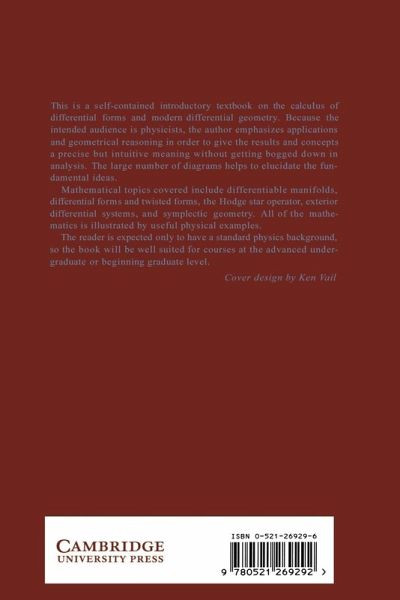 This is a self-contained introductory textbook on the calculus of differential forms and modern differential geometry. The intended audience is physicists, so the author emphasises applications and geometrical reasoning in order to give results and concepts a precise but intuitive meaning without getting bogged down in analysis. The large number of diagrams helps elucidate the fundamental ideas. Mathematical topics covered include differentiable manifolds, differential forms and twisted forms, the Hodge star operator, exterior differential systems and symplectic geometry. All of the mathematics is motivated and illustrated by useful physical examples.