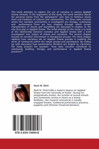 This study attempts to explore the use of narrative in various Applied Drama contexts. In the arguments of this study, the word narrative stands for personal stories from the participants own lives or fictitious stories from oral traditions of cultures and communities. The three main contexts where the narrative intervention is investigated are therapy, community and performance. There are four chapters through which certain characteristics of stories and storytelling are discussed in relation to the role they play in Applied Drama. The initial attempt of the study is to look at the relationship between narrative and Applied Drama with a brief investigation into origins of drama and narratives. The second chapter focuses on narrative intervention in therapeutic process. The third chapter explores how narratives aid an Applied Drama practise in building the sense of community within the target groups and participants. By ending up with discussing how performance elements are shaped by narratives, the study answers the question: how does narrative contribute to community building, therapy and performance in Applied Drama practices?