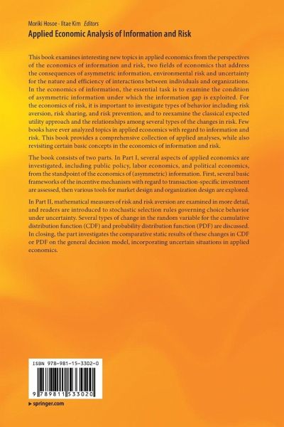 This book examines interesting new topics in applied economics from the perspectives of the economics of information and risk, two fields of economics that address the consequences of asymmetric information, environmental risk and uncertainty for the nature and efficiency of interactions between individuals and organizations. In the economics of information, the essential task is to examine the condition of asymmetric information under which the information gap is exploited. For the economics of risk, it is important to investigate types of behavior including risk aversion, risk sharing, and risk prevention, and to reexamine the classical expected utility approach and the relationships among several types of the changes in risk. Few books have ever analyzed topics in applied economics with regard to information and risk. This book provides a comprehensive collection of applied analyses, while also revisiting certain basic concepts in the economics of information and risk.