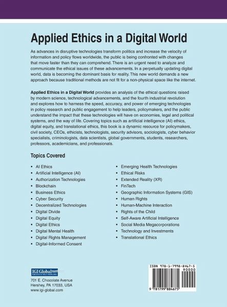 As advances in disruptive technologies transform politics and increase the velocity of information and policy flows worldwide, the public is being confronted with changes that move faster than they can comprehend. There is an urgent need to analyze and communicate the ethical issues of these advancements. In a perpetually updating digital world, data is becoming the dominant basis for reality. This new world demands a new approach because traditional methods are not fit for a non-physical space like the internet. Applied Ethics in a Digital World provides an analysis of the ethical questions raised by modern science, technological advancements, and the fourth industrial revolution and explores how to harness the speed, accuracy, and power of emerging technologies in policy research and public engagement to help leaders, policymakers, and the public understand the impact that these technologies will have on economies, legal and political systems, and the way of life. Covering topics such as artificial intelligence (AI) ethics, digital equity, and translational ethics, this book is a dynamic resource for policymakers, civil society, CEOs, ethicists, technologists, security advisors, sociologists, cyber behavior specialists, criminologists, data scientists, global governments, students, researchers, professors, academicians, and professionals.