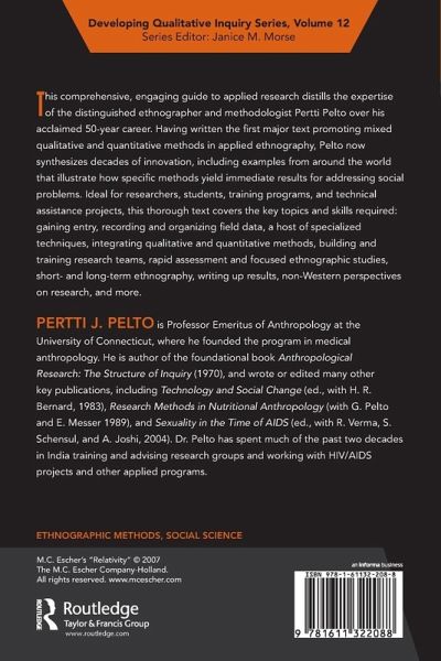This comprehensive, engaging guide to applied research distills the expertise of the distinguished ethnographer and methodologist Pertti Pelto over his acclaimed 50-year career. Having written the first major text promoting mixed qualitative and quantitative methods in applied ethnography in the 1970s, Pelto now synthesizes decades of innovation, including examples from around the world that illustrate how specific methods yield immediate results for addressing social problems. Ideal for researchers, students, training programs, and technical assistance projects, this thorough text covers the key topics and skills required: gaining entry, recording and organizing field data, a host of specialized techniques, integrating qualitative and quantitative methods, building and training research teams, rapid assessment and focused ethnographic studies, short- and long-term ethnography, writing up results, non-Western perspectives on research, and more.