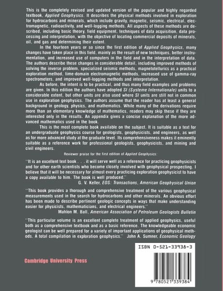 Completely revised and updated, this new edition of the popular and highly regarded textbook, Applied Geophysics, describes the physical methods involved in exploration for hydrocarbons and minerals. These tools include gravity, magnetic, seismic, electrical, electromagnetic, and radioactivity studies. All aspects of these methods are described, including theoretical considerations, data acquisition, and data processing and interpretation, with the objective of locating concentrations of natural resources and defining their extent. In the past fourteen years or so since the writing of Applied Geophysics, there have been many changes in the field of exploration geophysics. The authors give full treatment to changes in this field, which include improved techniques for calculating gravity fields, the use of proton-precession and optically-pumped magnetometers, improved quality of seismic data, magnetotelluric as a practical exploration method, new electromagnetic exploration methods, the use of gamma-ray spectrometers in radioactive exploration, and improved well-logging techniques. The intent is to be practical, and thus many actual examples and problems are given. Moreover, wherever possible in this edition the authors adopt the use of Systè me Internationale (SI) units, which were not in standared use at the time of the first edition. The reader needs only a general background knowledge of geology, physics, and mathematics. Most of the math can be skipped by those interested only in the results. Advanced mathematical concepts are explained in the appendix.