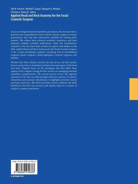 This multi-authored, multi-institutional, and multi-specialty based text is designed to inform and refresh practitioners who perform facial cosmetic surgery. Divided into three distinct sections for ease of use, the first section focuses exclusively on localized anesthesia for each region of the head and neck. Chapters focus on the techniques that best affect these regions with a chapter closing the first section, on managing potential anesthetic complications. The second section covers the regional anatomy of the face by offering high definition photos of cadaver dissections and anatomic illustrations to highlight pertinent muscle and bone structures. The third and final section combines the skills detailed in the first two sections and applies them to a variety of surgical, cosmetic procedures. In an era of high demand for aesthetic procedures, this text provides a practical and comprehensive look at facial cosmetic surgery to ensure practitionershave the best information available for treating their patients. The editors have extensive academic experience and have authored multiple scientific publications, while the contributions included in the text have been written by experts and leaders in the field. Applied Head and Neck Anatomy for the Facial Cosmetic Surgeon is written for a multi-disciplinary audience including oral & maxillofacial surgeons, plastic surgeons, otolaryngologists, cosmetic surgeons, and dentists.