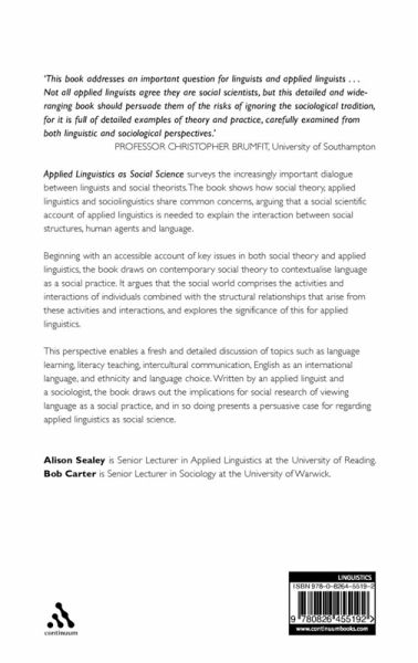 Applied Linguistics as Social Science surveys the increasing dialogue between linguistics and social theory. The book shows how social theory, applied linguistics and sociolinguistics share a set of common concerns, and how an analysis of these to produce a social scientific account of applied linguistics helps to explain the interaction between social structures, human agents and language. Foreword . Introduction . Making connections: some key issues in social theory and applied linguistics . Sociology and ideas about language . Language as a cultural emergent property . Researching language learning: theories, evidence, claims . Social categories and theoretical descriptions . Social domain theory: interpreting intercultural communication . Language in the world: properties and powers . A social realist approach to research in applied linguistics