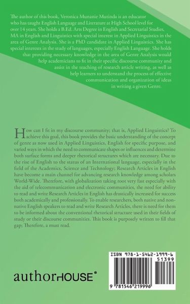 How can I fit in my discourse community; that is, Applied Linguistics? To achieve this goal, this book provides the basic understanding of the concept of genre as now used in Applied Linguistics, English for specific purpose, and varied ways in which the need to communicate shapes or influences and determine both surface forms and deeper rhetorical structures which are necessary. Due to the rise of English to the status of an International language, especially in the field of the Academics, Science and Technology; Research Articles in English have become a main channel for advancing research knowledge among scholars World-Wide. Therefore, with globalization taking root very fast especially with the aid of telecommunication and electronic communities, the need for ability to read and write Research Articles in English has drastically increased for success both academically and professionally. To enable researchers, both native and non-native English speakers to read and write Research Articles, there is need for them to be informed about the conventional rhetorical structure used in their fields of study or their discourse communities. This book is purposely written to fill that gap; Therefore, a must read.