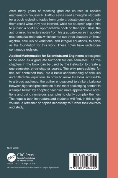 Applied Mathematics for Scientists and Engineers is designed to be used as a graduate textbook for one semester. The five chapters in the book can be used by the instructor to create a one-semester, three-chapter course. The only prerequisites for this self-contained book are a basic understanding of calculus and differential equations. In order to make the book accessible to a broad audience,the author endeavored to strike a balance between rigor and presentation of the most challenging content in a simple format by adopting friendlier, more approachable notations and using numerous examples to clarify complex themes. The hope is both instructors and students will find, in this single volume, a refresher on topics necessary to further their courses and study.