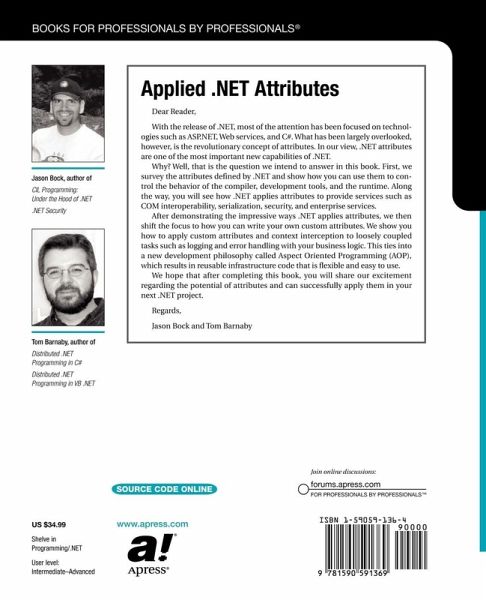 This book focuses on a part of .NET called "attributes". Attributed programming is a feature of .NET that is still relatively unexplored and unknown, yet is extremely important and will become more important over time. Attributes are used to modify the runtime behavior of code in the .NET framework. The book covers the fundamentals of attributes, common .NET attributes, use of custom attributes, and advanced techniques.