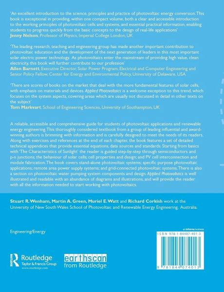 A reliable, accessible and comprehensive guide for students of photovoltaic applications and renewable energy engineering. This thoroughly considered textbook from a group of leading influential and award-winning authors is brimming with information and is carefully designed to meet the needs of its readers. Along with exercises and references at the end of each chapter, the book features a set of detailed technical appendices that provide essential equations, data sources and standards. Starting from basics with 'The Characteristics of Sunlight' the reader is guided step-by-step through semiconductors and p-n junctions; the behaviour of solar cells; cell properties ad design; and PV cell interconnection and module fabrication. The book covers stand-alone photovoltaic systems; specific purpose photovoltaic systems; remote are power supply systems; and grid-connected photovoltaic systems. There is also a section on photovoltaic water pumping system components and design. Applied Photovolatics is well illustrated and readable with an abundance of diagrams and illustrations, and will provide the reader with all the information needed to start working with photovoltaics.