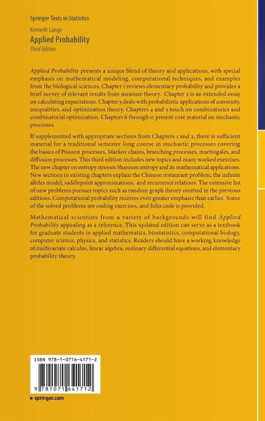 Mathematical scientists from a variety of backgrounds will find Applied Probability appealing as a reference. This updated edition can serve as a textbook for graduate students in applied mathematics, biostatistics, computational biology, computer science, physics, and statistics. Readers should have a working knowledge of multivariate calculus, linear algebra, ordinary differential equations, and elementary probability theory.