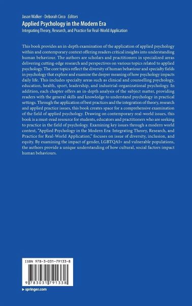 This book provides an in-depth examination of the application of applied psychology within and contemporary context offering readers critical insights into understanding human behaviour. The authors are scholars and practitioners in specialized areas delivering cutting-edge research and perspectives on various topics related to applied psychology. The core topics reflect the diversity of human behaviour and specialty fields in psychology that explore and examine the deeper meaning of how psychology impacts daily life. This includes specialty areas such as clinical and counselling psychology, education, health, sport, leadership, and industrial-organizational psychology. In addition, each chapter offers an in-depth analysis of the subject matter, providing readers with the general skills and knowledge to understand psychology in practical settings. Through the application of best practices and the integration of theory, research and applied practice issues, this book creates space for acomprehensive examination of the field of applied psychology. Drawing on contemporary real-world issues, this book is a must-read resource for students, educators and practitioners who are seeking to practice in the field of psychology. Examining key issues through a modern world context, " Applied Psychology in the Modern Era: Integrating Theory, Research, and Practice for Real-World Application," focuses on issue of diversity, inclusion, and equity. By examining the impact of gender, LGBTQAI+ and vulnerable populations, the authors provide a unique understanding of how cultural, social factors impact human behaviours.