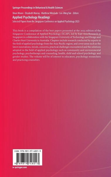 This book is a compilation of the best papers presented at the 2023 edition of the Singapore Conference of Applied Psychology (SCAP), led by East Asia Research in Singapore in collaboration with the Singapore University of Technology and Design and Charles Sturt University in Australia. Chapters include research conducted by experts in the field of applied psychology from the Asia-Pacific region, and cover areas such as the latest innovations, trends, concerns, practical challenges encountered and the solutions adopted in the field of applied psychology such as community and environmental psychology, psychotherapy and counseling, health, child and school psychology, and gender studies. The volume will be of interest to educators, psychology researchers and practicing counselors.