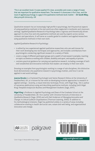 SECTION 1: INTRODUCING APPLIED QUALITATIVE RESEARCH IN PSYCHOLOGY 1. Applying Qualitative Research in Psychology;Joanna Brooks and Nigel King 2. Approaches to Qualitative Psychology;Joanna Brooks and Nigel King 3. Carrying Out an Applied Qualitative Research Project;Nigel King and Joanna Brooks SECTION 2: REAL WORLD EXAMPLES OF APPLIED QUALITATIVE RESEARCH 4. Exploring Men's Experiences of Diagnosis and Treatment for Prostate Cancer;Peter Branney, Clare Strickland, Frances Darby, Lisa White and Sunjay Jain 5. Using Interpretative Phenomenological Psychology in Organisational Research with Working Carers;Leah Tomkins 6. Participatory Methods in Research with Children: The Scripted Cartoons Narrative of Bullying (SCAN) Drawings Method;Helen Cowie and Dawn Jennifer 7. Using Interpretative Phenomenological Analysis in Conjunction with the Think Aloud Technique to Examine Experience of Living with Disfiguring Conditions with a View to Developing Psychosocial Interventions;Andrew Thompson 8. Methods for Community Research, Action and Change;Michael Murray and Katie Wright-Bevans 9. Using Discourse Analysis in Social Psychology;Kirsty Budds, Abigail Locke and Viv Burr 10. Digging Deeper: Using Grounded Theory to Explore Meanings of Gardens and Gardening across the Lifespan;Harriet Gross and Vicky Alfrey 11. Understanding Disability, Physical Activity and Sport through Innovative Qualitative Methods: Mobile Interviewing, Autophotography and Creative Non fiction;Brett Smith and Anthony Papathomas 12. Exploring the Response to Diversity and Equality in English Prisons: An Appreciative Inquiry;Victoria Lavis, Charles Elliott and Malcolm Cowburn 13. Using Construct Elicitation and Laddering in the Education of Social Work Students: Exercises in Reflexive Practice;Viv Burr and Nigel King 14. The Pictor Technique: Exploring Experiences of Collaborative Working from the Perspectives of Generalist and Specialist Nurses;Nigel King, Joanna Brooks, Alison Bravington, Beth Hardy, Jane Melvin and David Wilde SECTION 3: ISSUES IN APPLYING QUALITATIVE PSYCHOLOGY IN REAL WORLD SETTINGS 15. Using Multiple Methods in Applied Qualitative Research;Rachel Shaw and David Hiles 16. Public Involvement in Qualitative Research;Delia Muir 17. Disseminating Qualitative Research: From Clarity of Writing to Collaborative Action;Flora Cornish and Sarah Honeywell