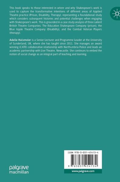 This book speaks to those interested in where and why Shakespeare's work is used to capture the transformative intentions of different areas of Applied Theatre practice (Prison, Disability, Therapy), representing a foundational study which considers subsequent histories and potential challenges when engaging with Shakespeare's work. This is grounded in a case study analysis of three salient British Theatre Companies: The Education Shakespeare Company (prison), the Blue Apple Theatre Company (Disability), and the Combat Veteran Players (therapy).